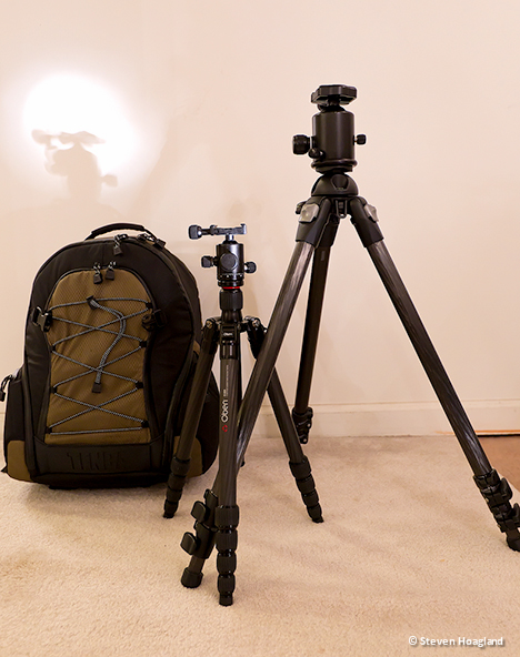 Travel to new places and don’t want to lug a heavy tripod around? I got a tip (thanks, Sherry) on the availability of a super new travel tripod from Oben… the CT-3510. Research showed that this carbon fiber tripod matched the features and capacities of the Gitzo Traveler GT-1541T. On my recent trip to New York City, I sauntered into B&H Photo (yeah, the actual store!) and checked out the most popular travel pods thoroughly. Honestly, I couldn’t find a more desirable travel pod than the Oben—at any price. It’s extremely light (3.2 lb with ball head attached), compact (15.5” folded up with ball head attached), and nearly 17 lb load capacity. Further, it is just beautiful. All the twist locks and knobs on the legs and ball head are rubberized for a nice grippy feel and tactile feedback that lends confidence that it’s locked down firmly. It also has nice touches like foot spikes you can install, and a removable leg that can be attached to the removable center post for a really cool monopod. I checked out the height with the legs fully extended and the center post down. It’s actually pretty tall for a travel pod. My back is thankful. It only takes a quarter-turn to unlock and lock the twist locks. And the legs can individually lock in two different angles, which helps in sloped or rocky terrain.